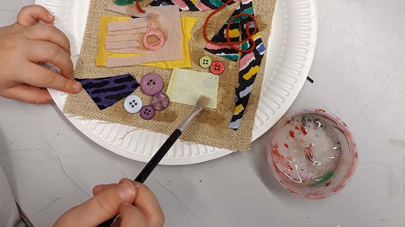 Vi gör collage av tyger och ritar stort till musik. Vi kollar tillsammans på Lewis Hendersons konst i konsthallen och inspireras till egna skapelser.